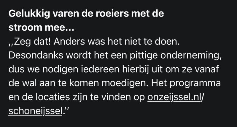 Op vrijdag 22 en zaterdag 23 september gaan roeiers van Daventre Portu (Deventer), Hattem Roeit (Hattem), Steuren van Staal (Kampen) en Sloeproeivereniging Zwolle (Zwolle) maar liefst 127 kilometer roeien van Rheden naar Kampen! Sloeproeier (en Oceaanroeier) Aidan Scherpbier leidt deze 'afzak'tocht'. Aidan ziet de afzaktocht met sloepen als een mooie kans om het belang van een schone IJssel te onderstrepen. ‘We gebruiken sloeproeien als metafoor: Sloepen zijn vanouds bedoeld voor reddingen op zee. Nu willen ze met sloepen aandacht vragen voor het ‘redden’ van zwerfafval, zodat het niet als plastic soep in zee terechtkomt. Want ook de IJssel staat in verbinding met de Oceaan.’